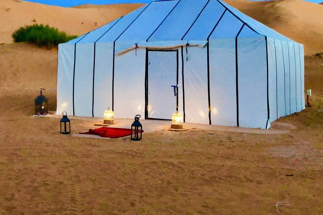 2 netter luksusglamping i Sahara (Telt med komfort og faciliteter som gode senger, privat bad med vask, dusj og vannklosett)